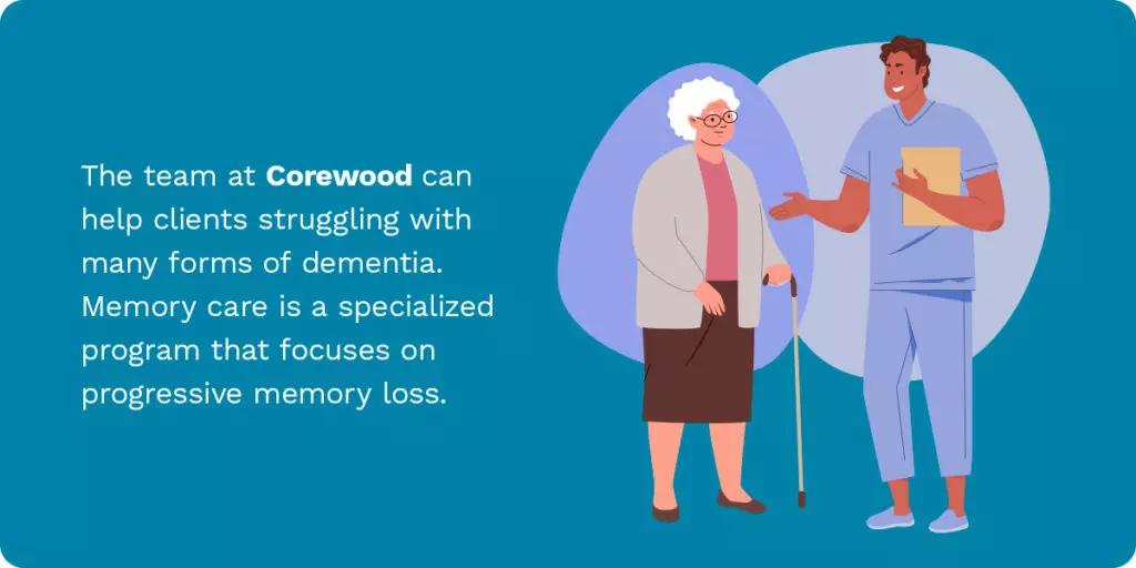 Dementia care is often the first step before symptoms become too severe. The team at Corewood can help clients struggling with many forms of dementia. Memory care is a specialized program that focuses on progressive memory loss. As such, clients in dementia care can expect adaptable services depending on their unique needs.